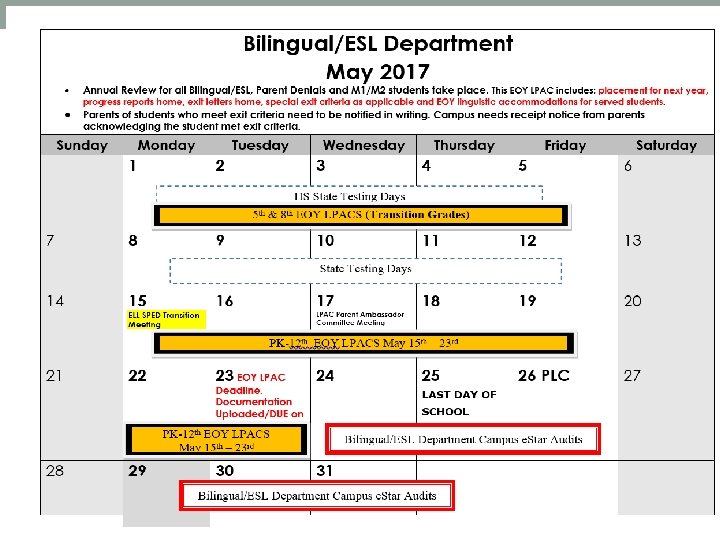 LPAC ANNUAL REVIEW -Testing of students in English for growth and exit -Progress letters -Exit letters -Review and/or Set New Special Education Exit Criteria -EOY EL instructional linguistic accommodations