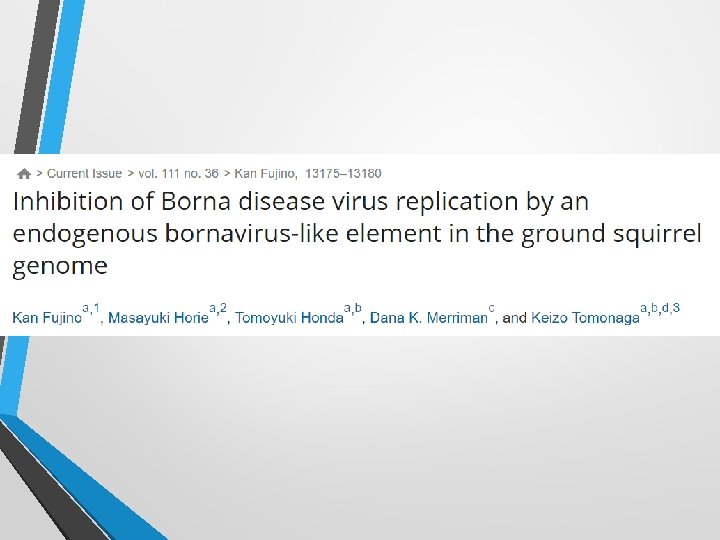 Endogenous bornavirus-like elements • (-)ss. RNA, Mononegavirales, Bornaviridae • EBLs (endogenous bornavirus-like elements) • Nucleoprotein • • EBLN Via LINE-1 element • Borna disease virus (BDV) • Antiviral immunity with EBLN elements