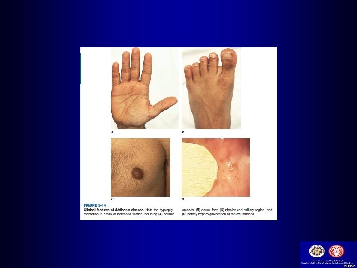 Endocrine Images: Addison’s Disease Clinical Findings in Addison’s Disease. Symptoms & Signs: • General malaise, fatigue. • Weakness and difficulty climbing stairs, arising from sitting, combing or shampooing hair. • Salt craving. NEJM 337: 1666, 1997 Signs: • Orthostatic hypotension. • Hyperpigmentation of extensor surfaces of skin, buccal mucosa, palmar creases. • Weakness of proximal muscle groups. Pertinent routine laboratory results: • Normocytic anemia • Neutropenia (mild) with eosinophilia. • Hyponatremia, hypokalemia and “non-gap” metabolic acidosis. • Mild hypoglycemia (may be pronounced in infants).