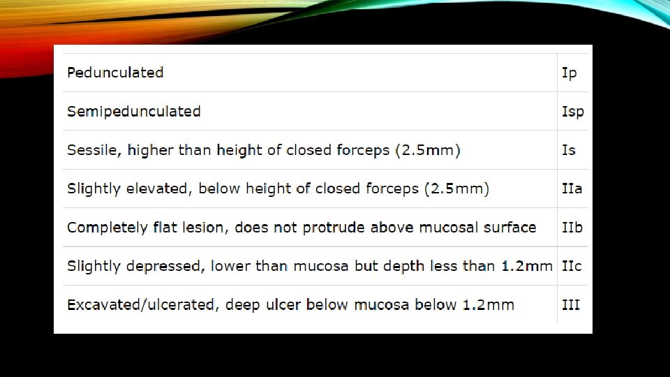 Paris 0 -1 ≤ 5 mm lesions have essentially 0% risk of harboring invasive cancer to 90% for 0 -III > 15 mm lesions. In general Paris 0 -2 B and 0 -2 C carry higher risk of colorectal invasion and high grade dysplasia. Depressed lesions with ulcerations or gross wall deformity have a high probability of harboring deeply invasive cancer.