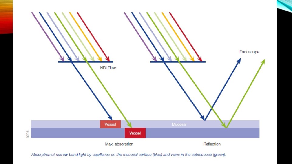 The placement of a NBI filter directly in front of the xenon arc lamp produces 2 narrow bands of light centered at the specific wavelengths of 415 nm and 540 nm. These 2 wavelengths correspond to the primary and secondary light absorption peaks of hemoglobin, respectively. In other words, the penetration depth of short-wavelength light into the biological tissue is shallow, it is diffused and absorbed near the tissue surface, and the light is observed as reflected light. In contrast, long -wavelength light can be propagated deep into the tissue.