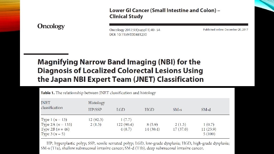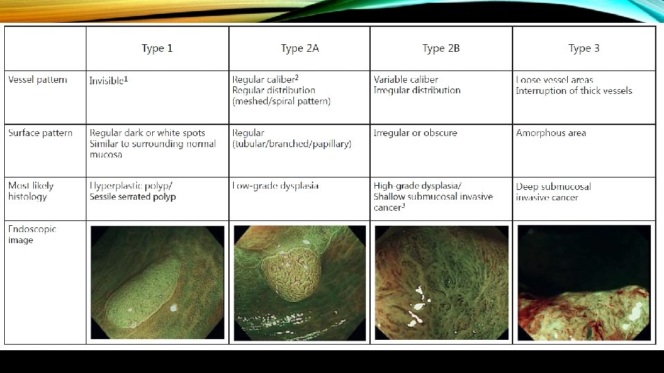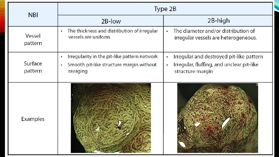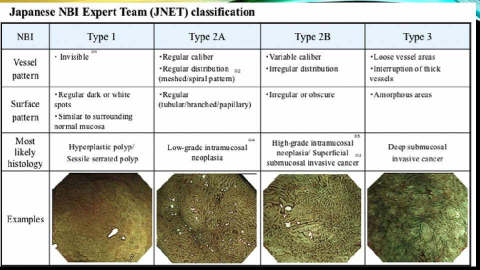 • The surface pattern is also helpful at predicting superficial submucosal invasion. Recently, the Japan Narrow Band Imaging Expert Team Classification (JNET) expands on the NICE to divide the NICE Type 2 lesions (conventional adenomas) into JNET Type 2 A and Type 2 B , with Type 2 B having an increased risk of superficial submucosal invasion.