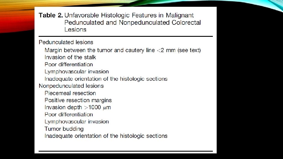 ESTIMATING THE RISK OF RESIDUAL CANCER IN THE BOWEL WALL AND LYMPH NODES AFTER ENDOSCOPIC RESECTION OF MALIGNANT PEDUNCULATED POLYPS • When submucosal invasion (adenocarcinoma of the colon or rectum) is identified in an endoscopically resected polyp, the pathologist must comment on the presence or absence of specific features associated with an increased risk of residual cancer in the bowel wall or lymph nodes. • The presence of one or more of these features are generally referred to as the presence of “unfavorable histologic criteria, ” and would warrant a decision to proceed with surgical resection, unless the risk of surgical resection is considered to outweigh the risk of residual cancer.