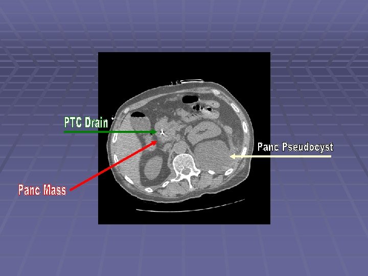 Patient DD 62 y. o. man with history of alcoholism and recurrent pancreatitis since the 1970’s, admitted to an outside hospital with jaundice MRI showed a large pancreatic head mass ERCP for biliary drainage – failed Complicated PTC by pancreatic tail pseudocyst formation with internalization - successful Patient left AMA and came to JMC EUS/FNA performed to obtain diagnosis