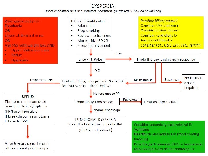 Dyspepsia Guidelines 2020 – Supporting notes Endoscopy Where community endoscopy is not available refer to secondary care This indication will currently be triaged as a Category 3 and patients will be placed on the routine endoscopy waiting list H. Pylori Treat according to local guidelines Advice and Guidance Consider discussion with local gastroenterology where there any concerns or where patient symptoms not responding