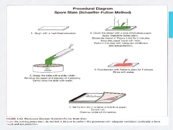 Endospore Staining (Schaeffer-fulton Method) 1) Make smears of each organism on separate slides. 2) Allow the slides to air dry, and then heat fix. 3) Apply a few drops of malachite green to the bacteria. Place the slides directly on a pre-warmed hot plate(enhance malachite green penetration) set on low for 3 -5 minutes. Do not allow the stain to evaporate. Apply additional stain, if necessary. 4) Remove the slides from the hot plate and allow them to cool. 5) Gently rinse the slides with water. 6) Apply enough safranin to the slides to cover the bacteria. Allow it to set for 1 -2 minutes.