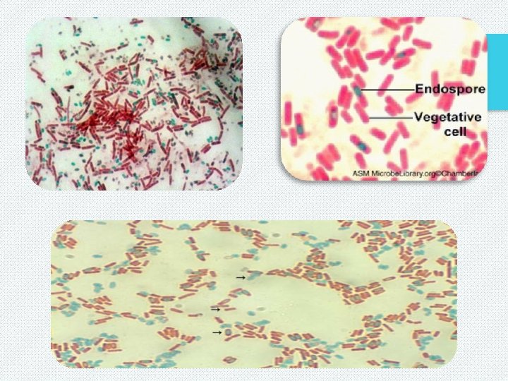 v Endospores can remain dormant indefinitely (not reproductive), but germinate quickly when the appropriate trigger is applied. v Metabolically inactive and dehydrated. v Stable for years. v Endospores differ significantly from the vegetative , or normally functioning cells. v Bacteria can form endospores in approximately 6 to 8 hours after being exposed to adverse conditions and germinate into a vegetative cell within 1. 5 hour. Sporulation (sporogenesis) Bacteria (vegetative cell) Germination Endospore