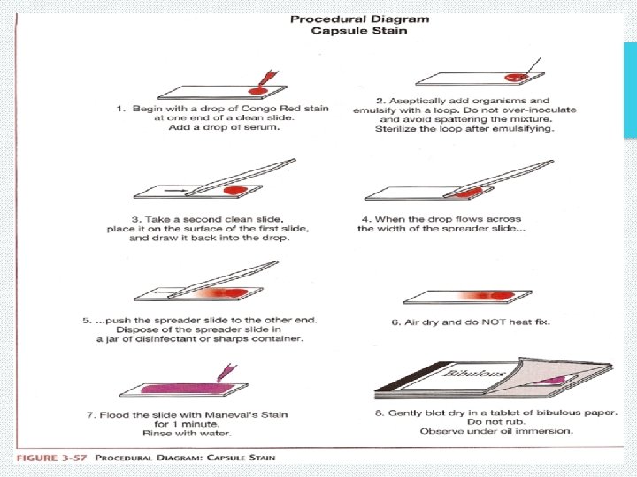 Anthony’s Method Procedure 1) Aseptically transfer a loopful of culture with an inoculating loop to the slide. Allow the slide to air dry. Do not heat-fix!. 2) Place the slide on a staining rack. Flood the slide with crystal violet and let stand for 4 to 7 minutes. 3) Rinse the slide thoroughly with 20% copper sulfate. 4) Blot dry with bibulous paper. 5) Examine under oil immersion (a coverslip is not necessary) Capsules appear as faint halos around dark cells.