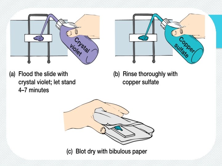ü Anthony’s Method v Anthony’s procedure employs two reagents. The primary stain is crystal violet, which gives the bacterial cell and its capsular material a dark purple color. Unlike the cell, the capsule is nonionic and the primary stain cannot adhere. v A 20% copper sulfate solution(Cu. SO 4) serves a dual role as both the decolorizing agent and counter stain. It removes excess primary stain as well as color from the capsule only and capsule appear faint/light blue. v In this procedure, smears should not be heat-fixed since shrinkage is likely to occur and create a clear zone around the bacterium, which can be mistaken for a capsule.
