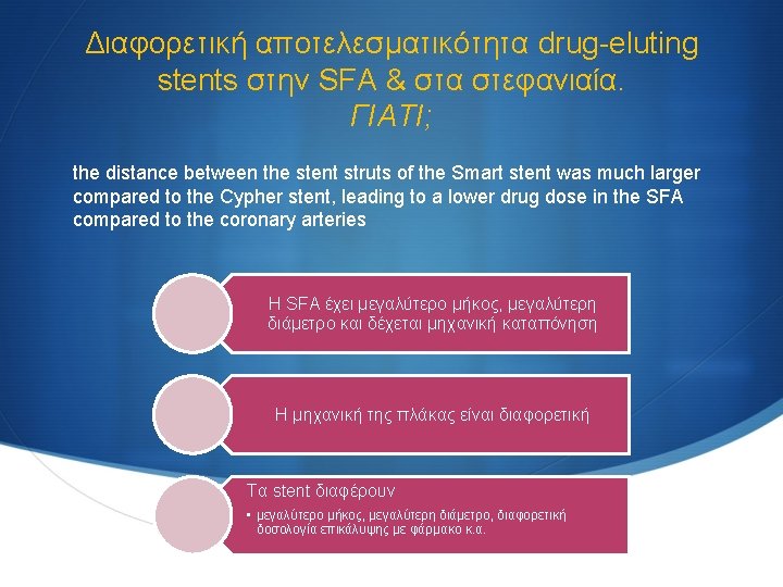 SMART stents στην SFA The only study which reported local drug delivery in the SFA was the Sirolimus-Coated Cordis Self-Expandable Stent (SIROCCO) trial, in which sirolimus-coated stents were not significantly superior to uncoated stents SIROCCO I & SIROCCO II trials μη στατιστικά σημαντική διαφορά μεταξύ των ασθενών που έφεραν sirolimus-eluting stents και αυτών που έφεραν baremetal stents στους 6 μήνες 0% Vs. 7. 7% επαναστένωση στην SFA δεν επιβεβαίωσαν την αποτελεσματικότητα του sirolimus Duda SH. Circulation 2002; 106: 1505– 1509. Duda SH. J Vasc Interv Radiol 2005; 16: 331– 338