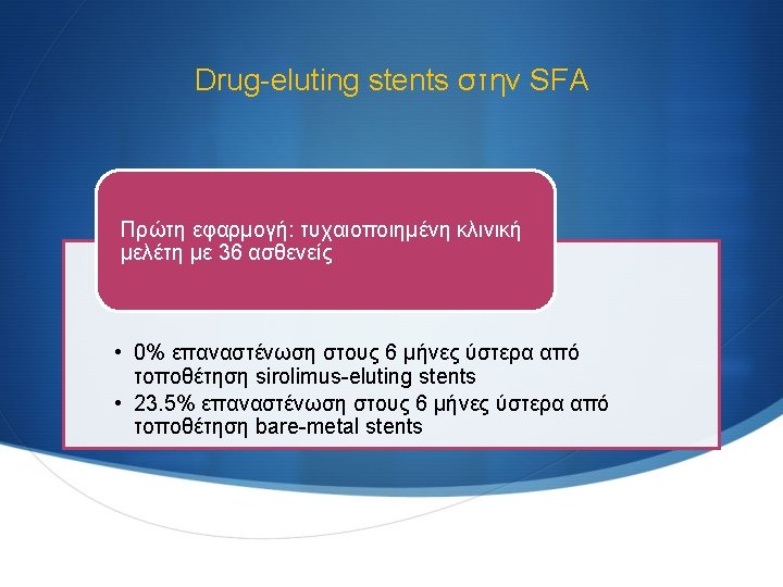 SMART stents στην SFA The only study which reported local drug delivery in the SFA was the Sirolimus-Coated Cordis Self-Expandable Stent (SIROCCO) trial, in which sirolimus-coated stents were not significantly superior to uncoated stents SIROCCO I & SIROCCO II trials μη στατιστικά σημαντική διαφορά μεταξύ των ασθενών που έφεραν sirolimus-eluting stents και αυτών που έφεραν baremetal stents στους 6 μήνες 0% Vs. 7. 7% επαναστένωση στην SFA δεν επιβεβαίωσαν την αποτελεσματικότητα του sirolimus Duda SH. Circulation 2002; 106: 1505– 1509. Duda SH. J Vasc Interv Radiol 2005; 16: 331– 338