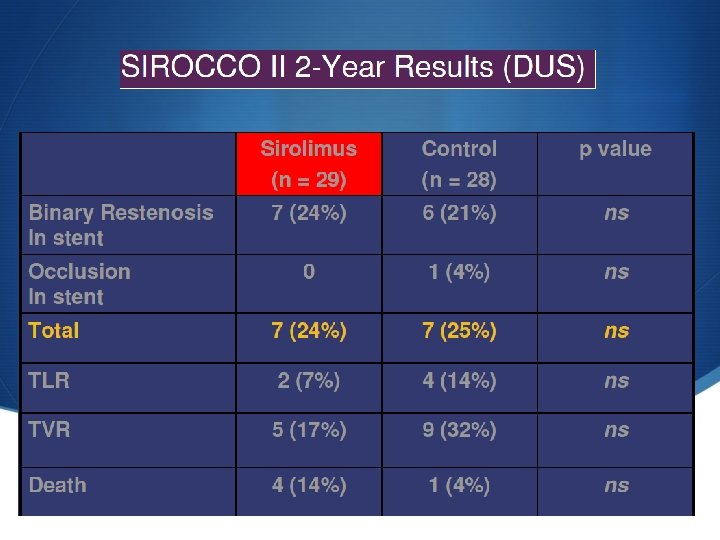 Local Taxane with Short Exposure for Reduction of Restenosis in Distal Arteries (THUNDER) trial S 154 patients (24% smokers, 49% diabetics) with femoropopliteal lesions S Paccocath (n=48 patients) S no adverse event S 6 months mean late lumen loss 0. 461. 2 mm vs. 1. 761. 8 mm for controls (p=0. 001) S 6 -month & 12 -month angiographic binary restenosis were 10% and 25% for the Paccocath patients vs. 41% and 59% for the control patients (p=0. 01) Currently, the use of antiproliferative agents, either exposed by stents or balloon catheters in preventing restenosis in infrainguinal arteries, is still investigational. Tepe G, et al. N Engl J Med. 2008; 358: 689– 99.