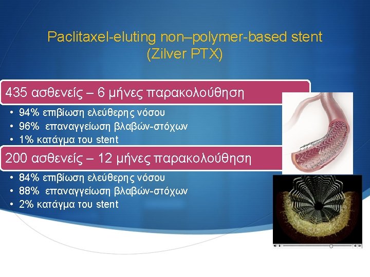Τύποι drug-eluting stents με εφαρμογή στην αγγειοχειρουργική Sirolimus-eluting stents (SMART stents) Paclitaxel-eluting non– polymer-based stent (Zilver PTX) Self-expanding polymerbased everolimuseluting stent (Dynalink. E)