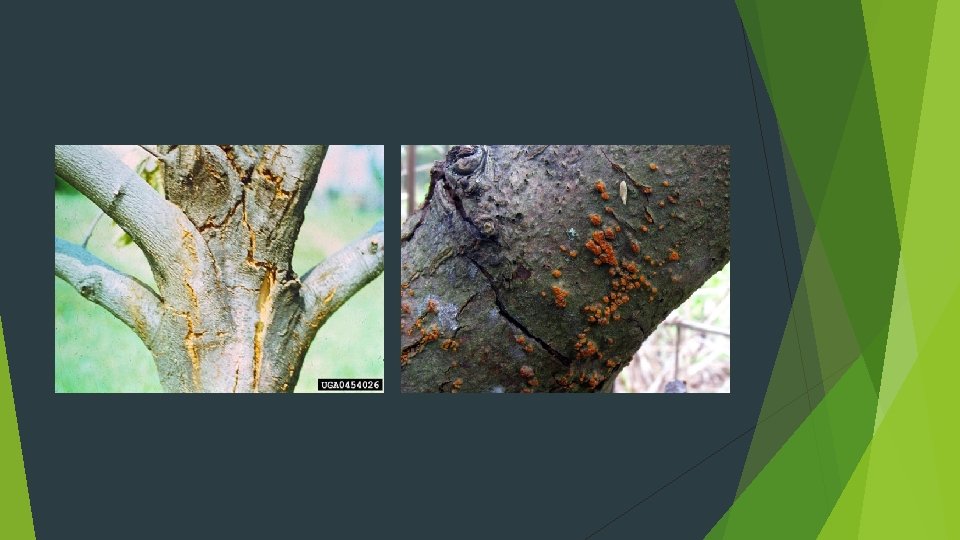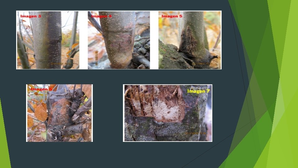 Otros signos y síntomas característicos son: -Corteza deprimida y a menudo de tonalidades rojizas en el frente de avance del hongo (imagen 3). -Corteza fisurada en las partes centrales del chancro y aparición de la madera al descubierto (imagen 4 y 5). -Pústulas rojo-anaranjadas sobre la parte de corteza afectada (imagen 6). -Micelio en forma de abanico creciente debajo de la parte externa de la corteza (imagen 7). -Es común también la aparición de brotes adventicios debajo de la infección. -Las hojas pertenecientes a la parte infectada del tronco se secan y se mantienen en el árbol incluso durante el invierno del mismo año.