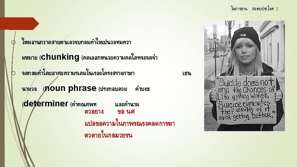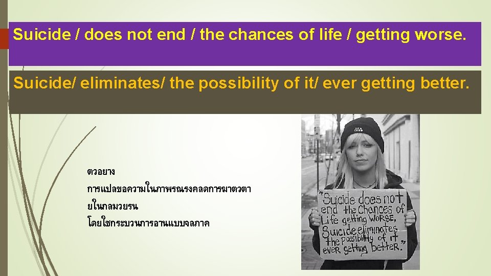Suicide does not end the chances of life getting worse. Suicide eliminates the possibility of it ever getting better. ตวอยาง ขอ นศ แปลขอความในภาพรณรงคลดการฆา ตวตายในกลมวยรน