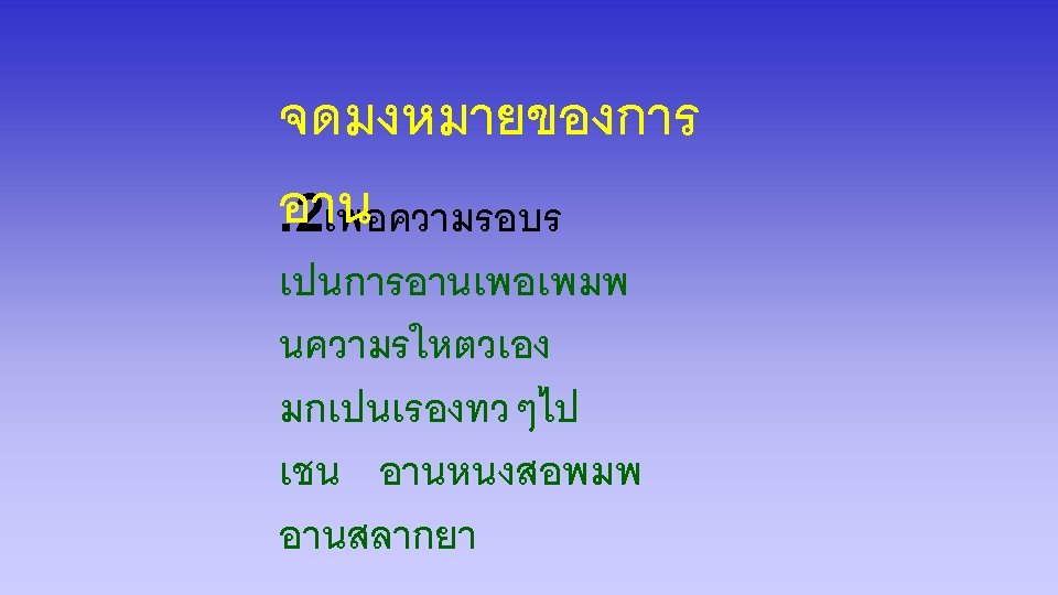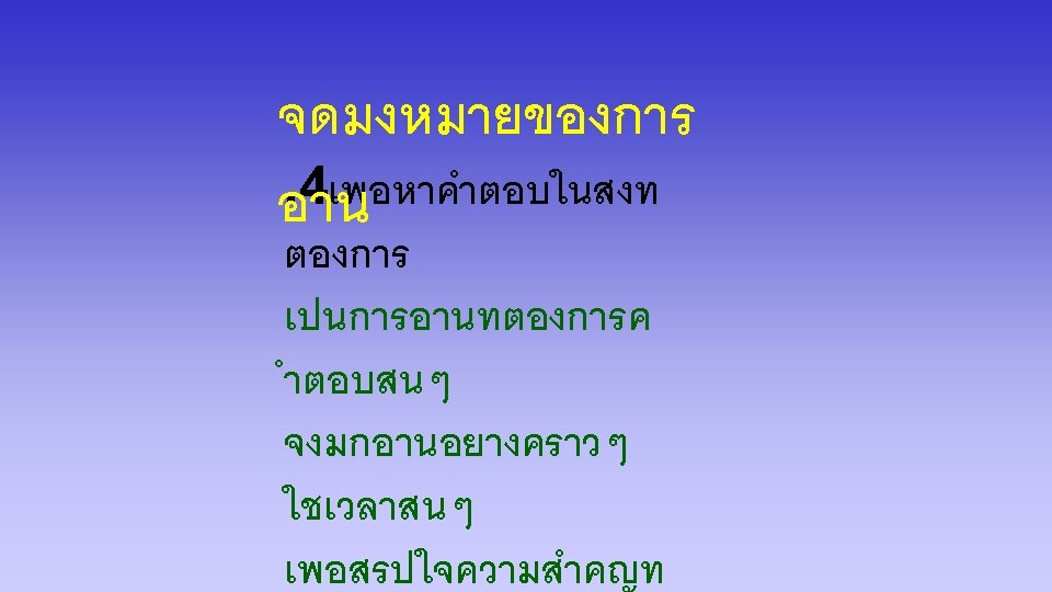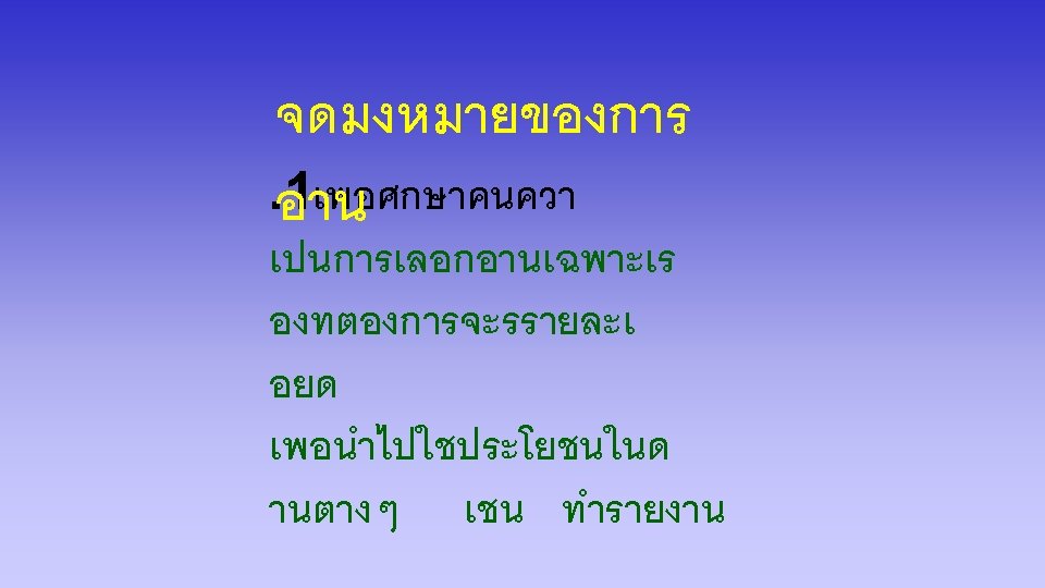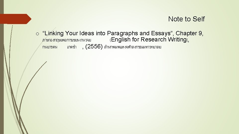 ������ o Sentence structure in reading text กมภาพนธ o Understanding complicated sentences in reading texts o ���������� )Reading for main ideas) มนาคม เมษายน o Writing a sentence o Introduction to a paragraph o Linking your ideas into paragraphs o References and Citations