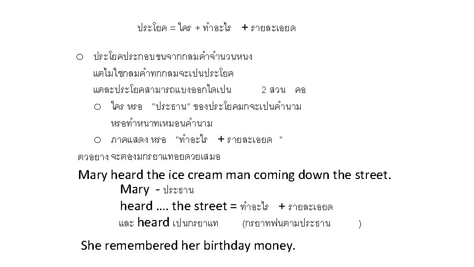 ขอทกทานชวยแปลประโยคตอไปน o The basketball team choose Charitt captain. o He considers her brilliant. o We thought Chico to be a fine player. ใคร + ทำอะไร + รายละเอยด