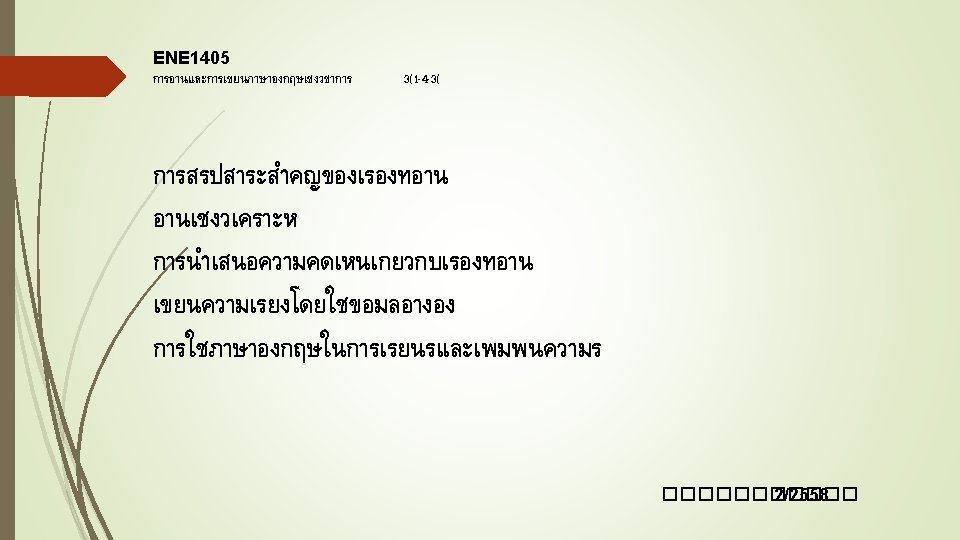 ENE 1404 การอานและการเขยนภาษาองกฤษเชงวชาการ (Reading and Writing for Academic Purposes 1( Thursday: Section 1 from 8. 00 – 13. 00 Section 2 from 13. 00 – 18. 00
