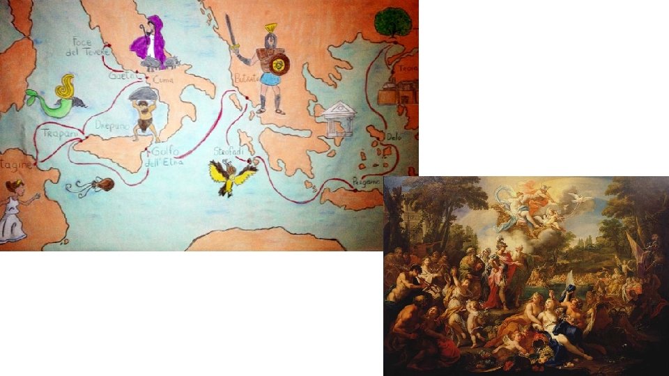b) Contenuto • Enea eroe troiano figlio di Venere e Anchise. • Sopravvive alla distruzione di Troia, parte alla ricerca di una nuova patria con il padre anziano, il figlio Ascanio e alcuni compagni (20 navi). Ha una missione svelata dall’oracolo di Apollo: trovare l’antica madre e stabilire lì la sua nuova patria. • È perseguitato dall’ira di Giunone nemica dei troiani che lo fa naufragare a Cartagine. Qui Enea incontra la regina Didone che gli chiede di raccontare la sua storia. (viaggi e avventure simili a Odisseo)