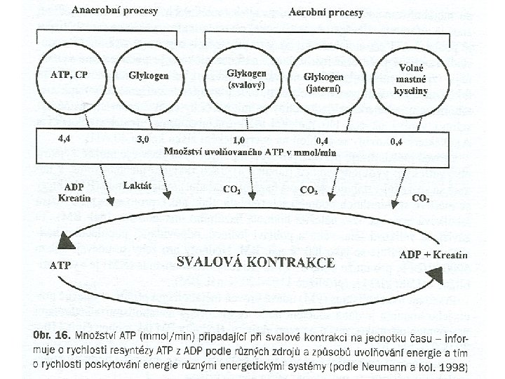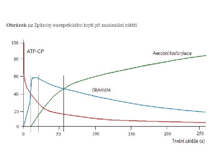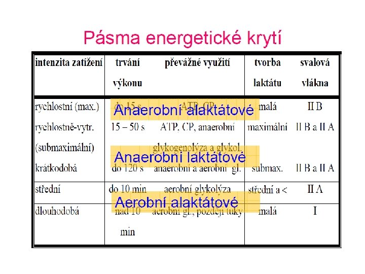 • 1) Rychlostní zatížení s dobou trvání výkonu přibližně 15 s využívá jako hlavní energetický zdroj systém makroergních (na energii bohatých) fosfátů ATP a CP (ATP – CP systém) s nepatrnou tvorbou laktátu • 2) Rychlostně vytrvalostní zatížení od 15 – 50 s využívá ATP a CP, navíc anaerobní glykolýzu s tvorbou laktátu. • 3) Zdrojem energie při vytrvalostním krátkodobém zatížení do 2 min je anaerobní glykolýza s velmi vysokou tvorbou laktátu (glykolytická fosforylace). • 4) Vytrvalostní zatížení střední 2 – 11 min využívá především glycidy se střední tvorbou laktátu • 5) dlouhé vytrvalostní zatížení 11 – 60 min využívá glycidy a lipidy, tvorba laktátu je malá. • 6) Velmi dlouhá doba zatížení delší než 60 min využívá jako energetický zdroj převážně lipidy a glycidy, laktát se tvoří v malé míře