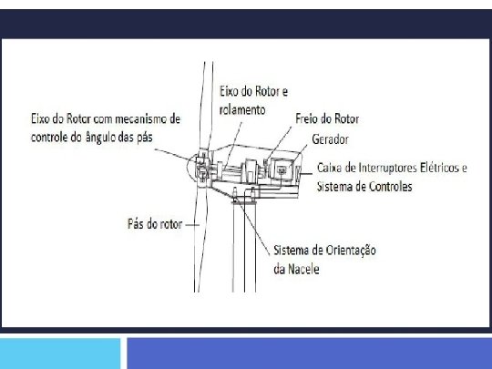 • Gerador – Converte energia mecânica em elétrica; • Mecanismo de Controle – Responsável pela orientação do rotor; • Sistema de Armazenamento – Responsável por armazenar a energia para a produção; • Transformador – Responsável pelo acoplamento elétrico entre o aerogerador e a rede elétrica;