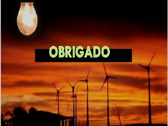 Referências • O mercado da energia eólica no mundo, disponível em: http: //exame. abril. com. br/meio-ambiente-e-energia/noticias/omercado-da-energia-eolica-no-mundo • Energia eólica no Brasil, disponível em: http: //www. brasil. gov. br/sobre/economia/energia/matrizenergetica/energia-eolica. • Energia eólica, documento da ANEEL, disponível em: http: //www. aneel. gov. br/aplicacoes/atlas/pdf/06 -energia_eolica(3). pdf • Ricardo Terciote. A energia eólica e o meio ambiente. UNICAMP Faculdade de. Engenharia Mecânica - Departamento de Energia.