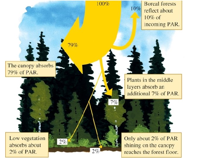 Only certain Wavelengths of Light are Used in Photosynthesis • Light Energy Used = ‘Photosynthetically Active Radiation’ or PAR – How Much is absorbed: Number of light energy (photons) striking square meter surface each second. • Chlorophyll absorbs light as photons. • Landscapes, water, and organisms can all change the amount and quality of light reaching an area. • Light not absorbed is reflected – Some in PAR + all in green and yellow wavelengths
