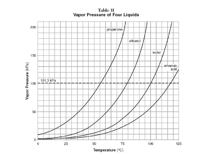 Table H Examples 1. What is the vapor pressure of water at 105 o. C? 2. If the pressure is 30 k. Pa, what temperature will water boil at? 3. What pressure is needed for ethanol to boil at 50 o. C? 4. Which liquid on Table H has the strongest intermolecular forces?