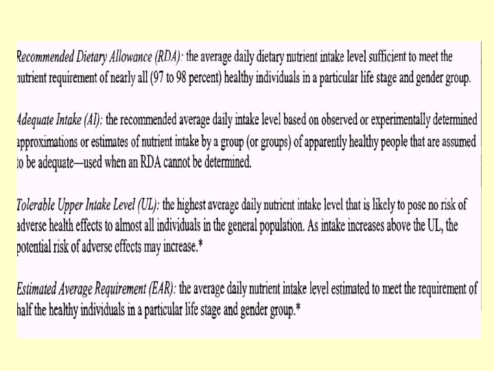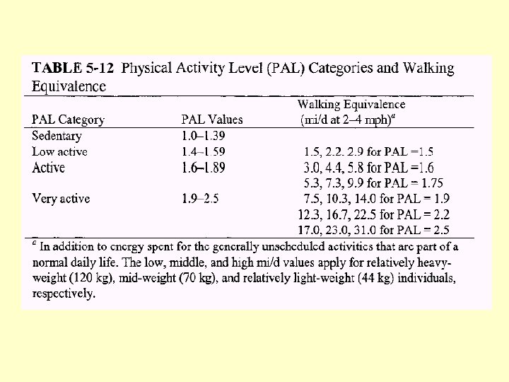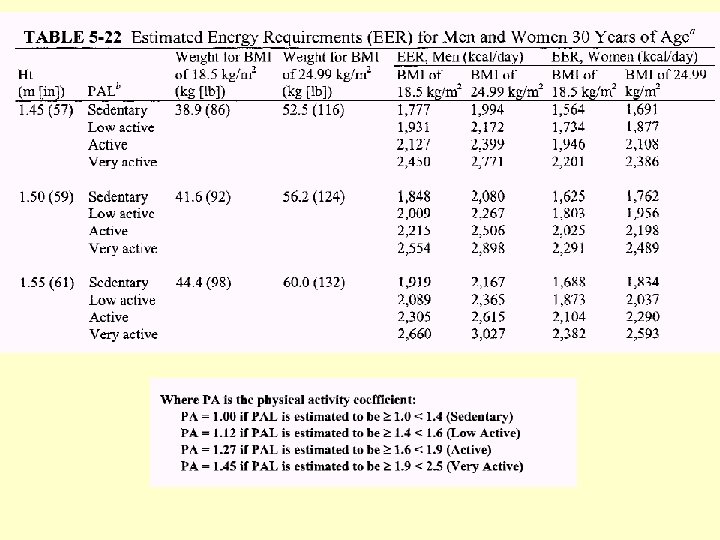 Estimated Energy Requirement • Average dietary energy intake that is predicted to maintain energy balance in a healthy adult of a defined age, gender, weight, height, level of physical activity consistent with good health. • In children, pregnant and lactating women the EER is taken to include the needs associated with deposition of tissues or secretion of milk