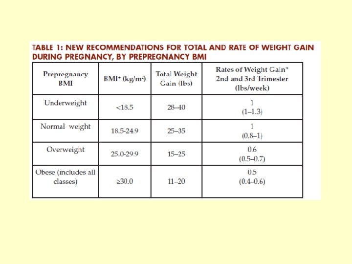 1990: Recommended total weight gain in pregnant women by prepregnancy BMI (in kg/m 2) Weight-for-height category Recommended total gain (kg) Low (BMI <19. 8) 12. 5– 18 Normal (BMI 19. 8– 26. 0) 11. 5– 16 High (BMI >26. 0– 29. 0)2 7– 11. 5 Adolescents and black women should strive for gains at the upper end of the recommended range. Short women (<157 cm) should strive for gains at the lower end of the range. The recommended target weight gain for obese women (BMI >29. 0) is 6. 0.