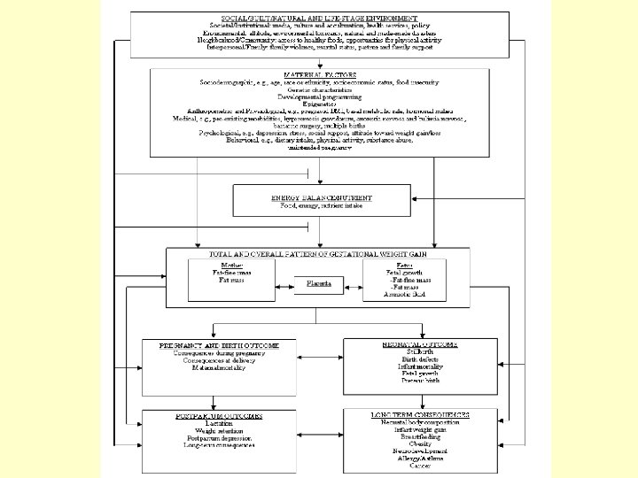 Determinants: Maternal Behaviors Diet Relationship between energy intake and GWG; insufficient evidence for diet composition and GWG Physical Inverse relationship between PA and Activity GWG Tobacco “Limited” evidence for inverse association with GWG; smoking has independent effect on birth weight. “There remains a lack of information to relate dietary intake or physical activity to GWG even though they are primary determinants of weigh gain in nonpregnant individuals. ”