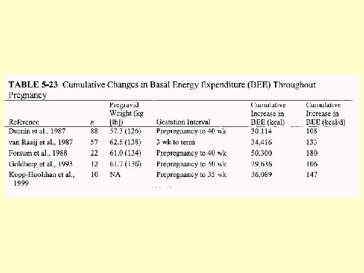Koop-Hoolihan, cont • Women with the largest cumulative increase in RMR deposited the least fat mass (this was the only prepregnant factor that predicted fat mass gain) • In all indices there was large individual variation • Average total energy cost of pregnancy was similar to work of Hytten and Leitch (1971) • Food intake records indicated 9% increase in kcals with pregnancy, but highly variable