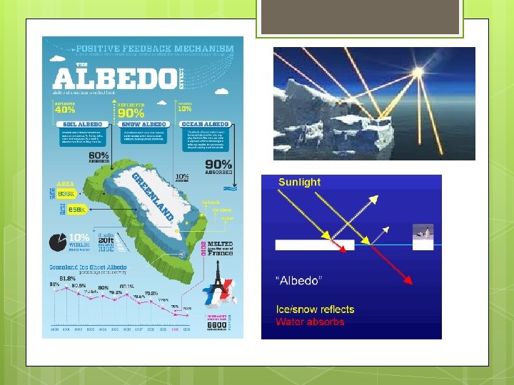Example 1: In areas where there is think snow or ice cover during the winter is the time when more of the suns energy would be reflected thus a higher albedo If the ice melts the water will absorb the suns rays Causing a temperature change in the water Animals and wildlife would have a hard time adapting to this new environment