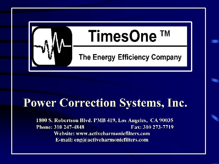 Energy Efficiency Guidelines Thank You ! For your time and interest in Power Correction Systems 1800 S. Robertson Blvd. PMB 419, Los Angeles, CA 90035 Phone: 310 247 -4848 Fax: 310 273 -7719 E-mail: bsegal@activeharmonicfilters. com Brahm Segal; Power Correction Systems, Inc.