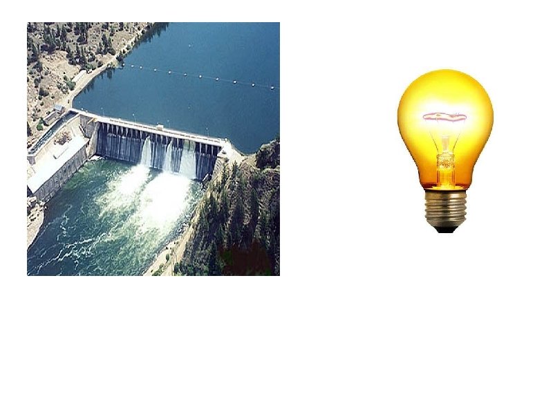 The potential energy of the water stored up high is changed to kinetic energy as it drops through the dam, which is converted to electrical energy to light the bulb, The light bulb gives off light & heat energy.