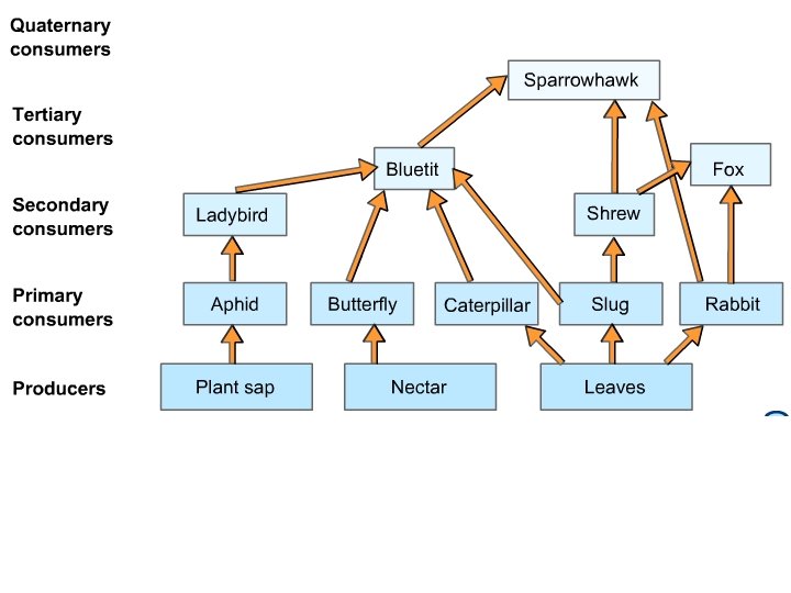 Organism Trophic Level Sun energy source grass producer grasshopper 1 st order consumer; Primary consumer (1°) mouse 2 nd order consumer; secondary consumer (2°) snake 3 rd order consumer; (3°) hawk 4 th order consumer; (4°); TOP CONSUMER