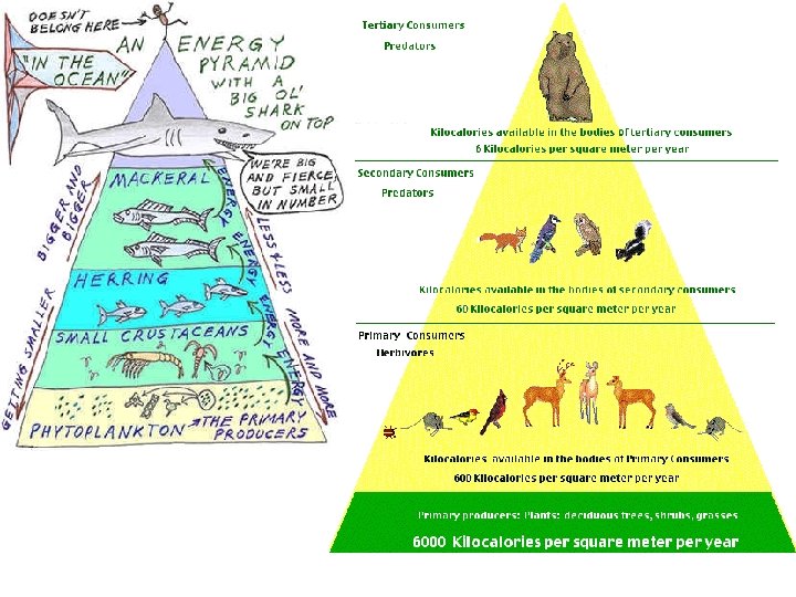 Energy Pyramid • The energy pyramid is biggest at the bottom because… “troph-” means to eat • more producers are needed to support the trophic levels above • if there were too many carnivores we wouldn’t have enough herbivores and the producers would overgrow