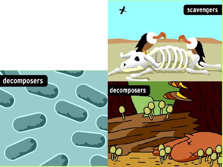 Producer Consumer takes non-living does not matter (energy produce its own from the sun, food; must eat water, minerals, carbon dioxide) and uses it to produce food (energy) for itself with surplus for other organisms Decomposer feeds off dead plants and animals and reduces their remains to minerals and gases again