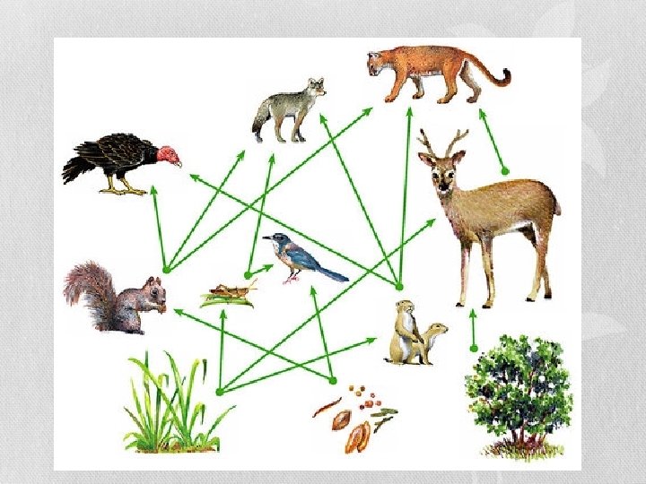 Food Chains and Food Webs • Food webs also show the transfer of energy between organisms. The arrow still points in the direction of the energy transfer. Food webs are useful in showing more complicated relationships in an ecosystem, since many organisms may eat more than one type of food, or may have more than one natural predator.