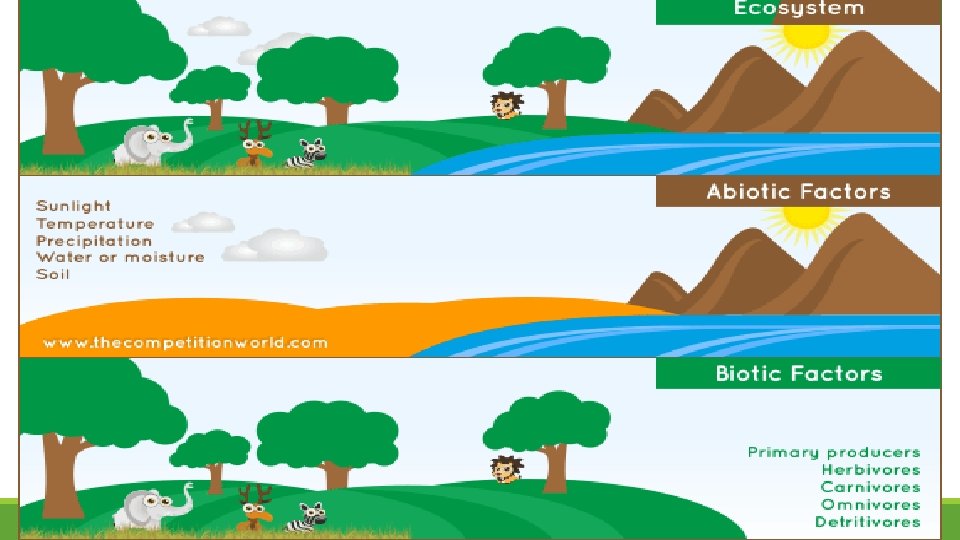 Environmental conditions §Include biotic factors and abiotic factors. §They directly affect one another.