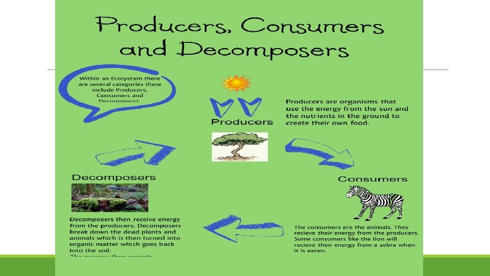 Create your own… Part 1: (Refer to pgs. 69 -72) üCollaborate with your group members to create a poster that illustrates how energy flows through an ecosystem. Your illustration must include an example of at least one of each: 1. primary producer (autotroph) 2. consumer (heterotroph) üBe specific on whether the consumer is a herbivore, carnivore, omnivore, detritivore, or a scavenger. 3. decomposer üOn a notecard, write one paragraph that explains your illustration and be sure to use appropriate vocabulary terms. HOLD ON to the posters; there are 2 more parts to illustrate in the other 2 sections of your poster!