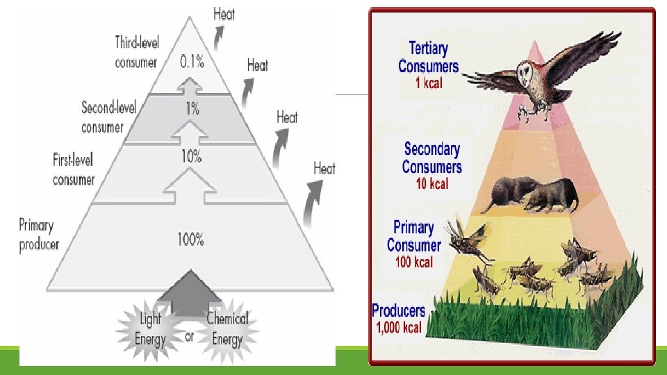 The 10% Rule (pg. 77) §On average, about 10% of the energy available within one trophic level is transferred to the next trophic level. § The more levels that exist between a producer and a given consumer, the smaller the percentage of the original energy from producers that is available to that consumer.