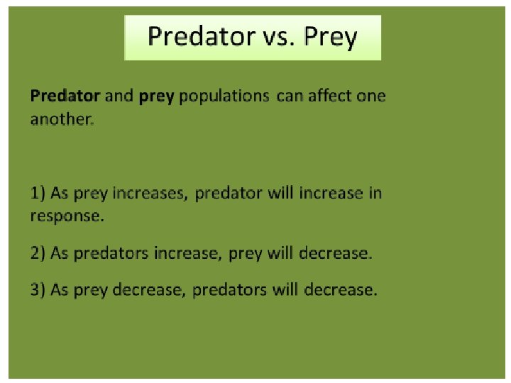 Populations are affected by many resources. These include: • The amount of food available in an area • The amount of sunlight (if it is a plant population) • The amount of water • The competition for food/shelter • The predators in an area