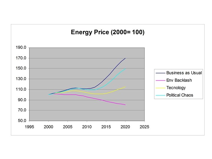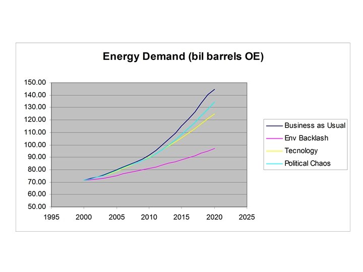 Four Assumed Scenarios 1. Business as usual. Global changes continue without great surprises or much change in energy patterns, other than those resulting from dynamics and trends already in place 2. Environmental backlash. The international environmental movement becomes more organized and violent, attacking fossil energy industries 3. High tech economy. Technological innovations accelerate beyond current expectations, and have large scale impacts in the energy supply mix and consumption patterns 4. Political turmoil. Increasing political instability and conflicts, relating to or resulting from energy needs and capacities