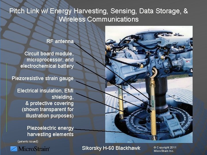Pitch Link w/ Energy Harvesting, Sensing, Data Storage, & Wireless Communications RF antenna Circuit board module, microprocessor, and electrochemical battery Piezoresistive strain gauge Electrical insulation, EMI shielding, & protective covering (shown transparent for illustration purposes) Piezoelectric energy harvesting elements (patents issued) Sikorsky H-60 Blackhawk © Copyright 2011 Micro. Strain Inc.