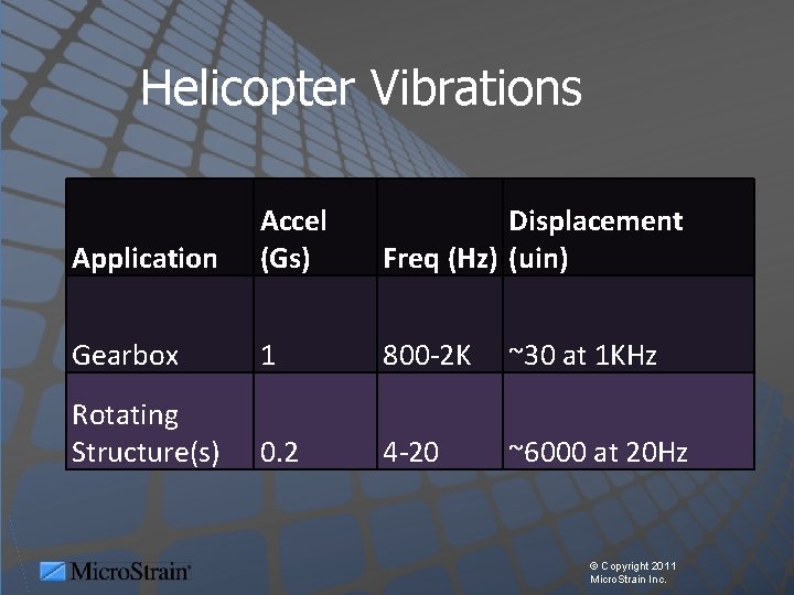 Helicopter Vibrations Application Accel (Gs) Displacement Freq (Hz) (uin) Gearbox 1 800 -2 K ~30 at 1 KHz Rotating Structure(s) 0. 2 4 -20 ~6000 at 20 Hz © Copyright 2011 Micro. Strain Inc.
