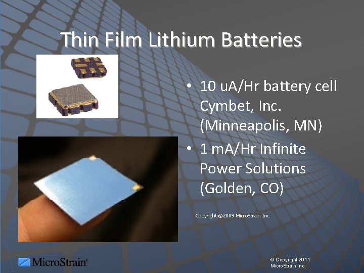 Thin Film Lithium Batteries • 10 u. A/Hr battery cell Cymbet, Inc. (Minneapolis, MN) • 1 m. A/Hr Infinite Power Solutions (Golden, CO) Copyright © 2009 Micro. Strain Inc © Copyright 2011 Micro. Strain Inc.