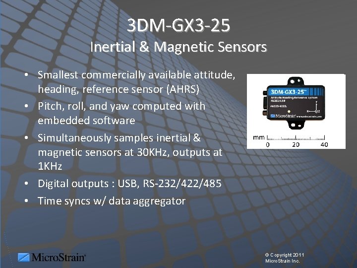 WSDA-MIL Sensor Data Aggregator • Ruggedized, sealed, fanless single board computer with 600 MHz Intel XScale processor, 2 GB Compact Flash, Linux 2. 6 • Integrated 3 DM-GX 3 -25 Intertial Sensor • Ethernet, USB, and serial interfaces • Synchronizes to GPS time • 3 ppm backup timing reference Patents pending © Copyright 2011 Micro. Strain Inc.