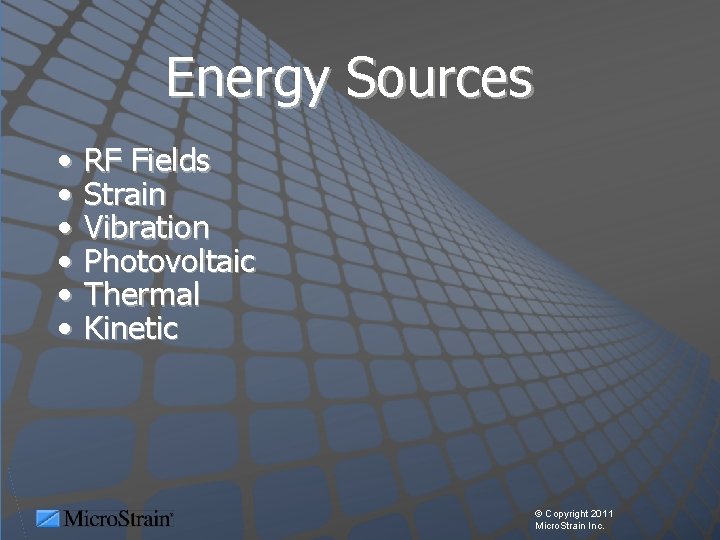 Energy Sources • • • RF Fields Strain Vibration Photovoltaic Thermal Kinetic © Copyright 2011 Micro. Strain Inc.