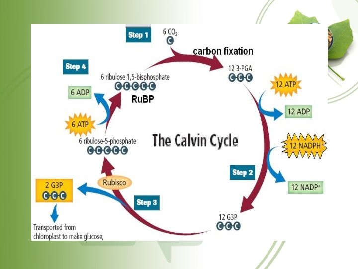 Stage 3 –The Calvin Cycle • The 2 energy storing molecules (ATP & NADPH) produced in the light reaction are used to form the organic compound glucose
